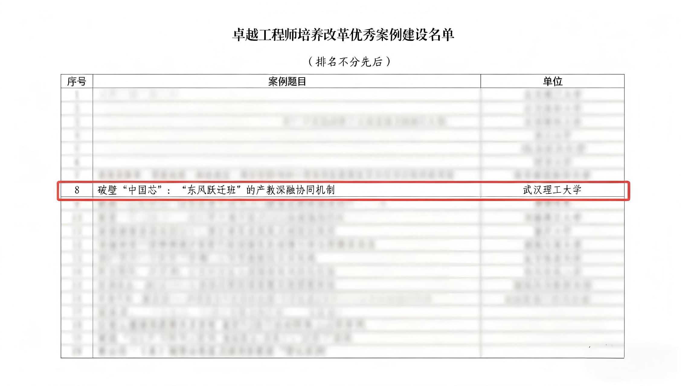 近日,中国卓越工程师培养联合体公布了2025年度卓越工程师培养优秀案例名单,武汉理工大学申报的《破壁“中国芯”:“东风跃迁班”的产教深融协同机制》成功入选,成为全国20个优秀案例之一。该案例聚焦校企协同机制创新,展现了学校在卓越工程师培养方面的深入探索与显著成效。